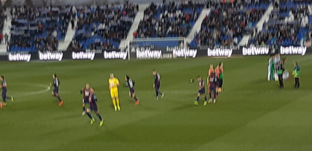 Jetzt aber ab ins Stadion. Unsere Jungs legten los wie die Feuerwehr und ehe die im ersten Durchgang lethargischen Spieler von Leganes überhaupt mitbekamen, wer da ständig an ihnen vorbeirannte, stand es schon 0:1 für unsere unschlagbaren Helden. KIKE GARCIA (29.) hatte mit seiner Rübe mal wieder zugeschlagen. Leganes weiter in gelähmter Manier, ein Freistoß von JOAN JORDAN (36.) schlug im linken Winkel unhaltbar ein. So konnte man denken; hier lockere drei Punkte einzufahren. Aber man kennt ja seine Eibarnesen, die immer für eine Überraschung gut sind. Und so wollten unsere Jungs den Vorsprung im zweiten Durchgang locker über die Zeit bringen, Leganes wurde stärker und der Marokkaner EN NESYRI netzte zweimal ein. Wuschelkopf CUCURELLA hat allein stehend vor dem Tor die Chance zum 3:2 für uns, aber er legt nutzlos quer. Am Ende können wir noch froh sein, hier nicht verloren zu haben. Wichtig jedoch, dass Mitkonkurrent Leganes hier keine drei Punkte einkassierte.