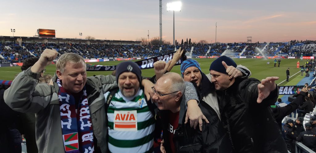 So machten wir uns auf den Weg nach Leganes. Das hochgepriesene Fanfestival verschiedener Fanclubs beider Vereine entpuppte sich dann als eine Veranstaltung mit ca. 30 Mann. Der leckere Wein und natürlich das Wiedersehen mit MATTHIAS und einigen anderen Supportern von URKO TALDEA führten zu einer großen Freude. Natürlich waren sich alle im Eibar-Lager über einen klaren Sieg der ARMEROS heute einig. Auf ging es zum Estadio Butarque oben auf einem Hang gelegen, von dem man einen phantastischen Blick auf ganz Madrid und die dahinter gelegene Sierra Guadarama hat, was heute aber total unwichtig war. Und plötzlich steht EL PRESIDENTE vor uns mit leicht grimmigen Gesicht aufgrund unseres Fernbleibens auf seine viel zu späte Einladung in eine andere Bodega vor dem Spiel. Nun gut, wir hatten es zuvor versucht aber die ELB-Patrioten waren einfach zu spät in Madrid angekommen. Streng überreichte EL PRESIDENTE uns einen Umschlag mit den Tickets für das Match. Die anderen Jungs von ELB waren wesentlich lockerer und begrüßten uns sehr freundlich allen voran unser kleiner Freund Fernando.