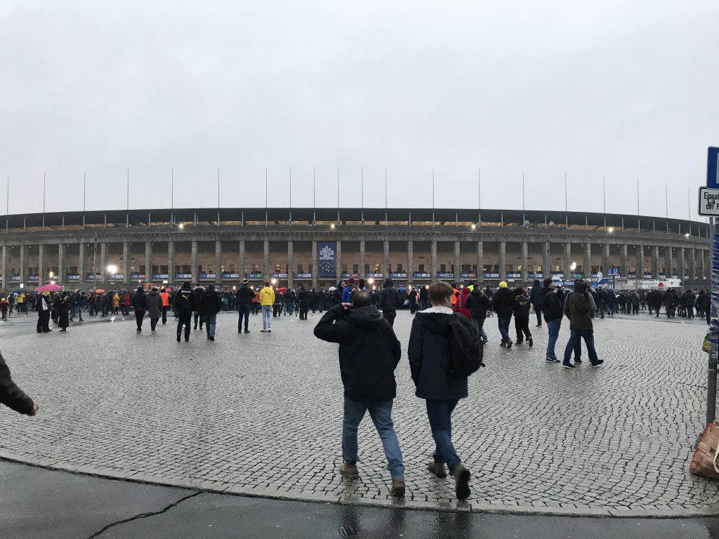 Nach gut 2 Stunden im Regen und ohne Fußball, dafür mit Bier und Bratwurst im Bauch ging es ins benachbarte Olympiastadion wo schon gut 19.000 Borussen auf uns und die Mannschaft warteten.  Zum Spiel: Es gab nicht wirklich ein Herantasten beider Mannschaften. BERLIN ging zweimal durch KALOU in Front, DELANEY gelang das zwischenzeitliche 1:1 für die Borussen, die mehr vom Spiel und in einer temporeichen Begegnung auch aus meiner Sicht die besseren Chancen hatten. BÜRKI sah beim 1:0 überhaupt nicht gut aus, dafür hatte DELANEY bei seinem Tor das Glück des Tüchtigen. Schiedsrichter Welz zeigte, nach Handspiel von WEIGL in der 35. Minute auf den Punkt. In unseren Augen ein strittiger aber dennoch vertretbarer Elfmeter, den KALOU, bei nassem Wetter trocken verwandelte.