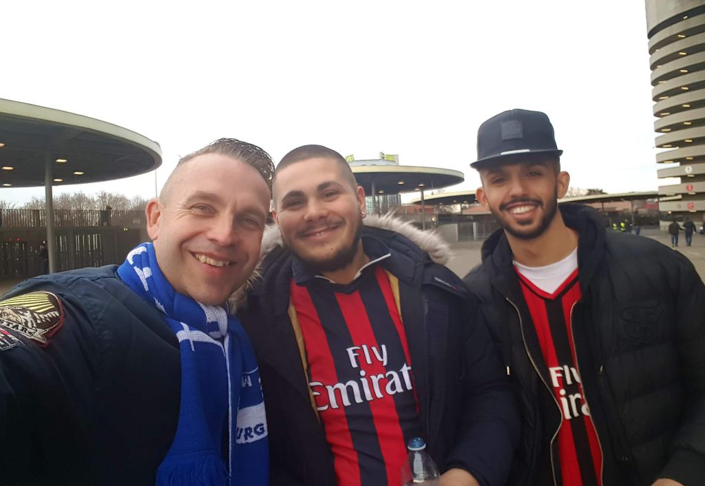 Bei der Ticketbestellung haben wir leider nicht beachtet, dass wir sämtliche Karten im Gästeblock geordert hatten und so wollte uns das zahlenmäßig leicht überlegene Security- Team mit unseren schönen neuen AC MAILAND Trikots erst einmal nicht ins Stadion lassen. Mit diesem Problem waren wir aber nicht allein und so fanden die Ordner nach kurzer Rücksprache dann auch schnell eine Möglichkeit. Wir wurden wie kleine Ehrengäste und zwar im Fahrstuhl zu unseren neuen Plätzen eskortiert und schlossen dabei schon die ersten Kontakte zu anderen MAILÄNDER- Fußballfans.