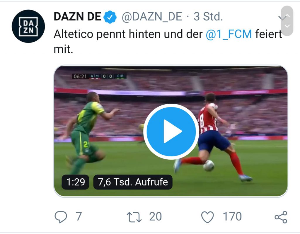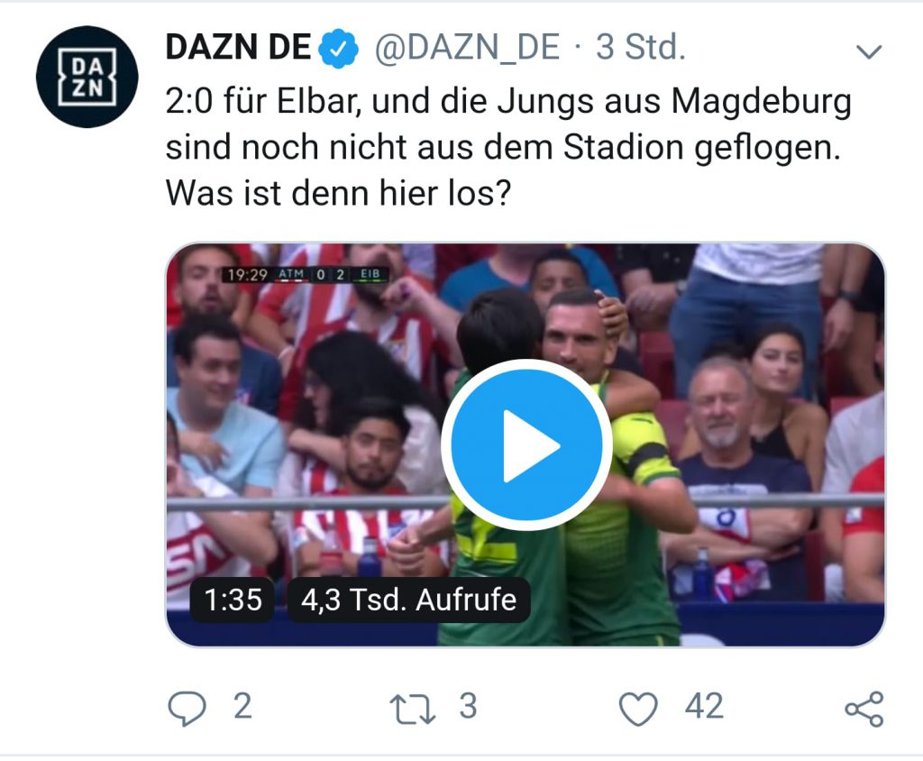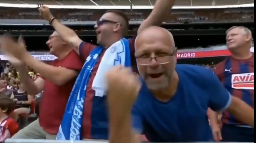 Wir sitzen in der ersten Reihe; unsere Augen praktisch auf Level der Grasnarbe. Der Referee pfeift an und in der 8. Minute gab es endlich gut Grund zum Jubel. CHARLES köpfte locker zum 0:1 ein. ATLETICO war gelähmt, was sich nach dem 0:2 für EIBAR nicht besserte. Ohne Lähmungen kam ein Kameramann direkt auf uns zu und filmte unseren Jubel für alle interessierten Zuschauer an den Fernsehgeräten dieser Welt. Eine zu sehr aufgerückte EIBAR-VERTEIDIGUNG ermögliichte Supertalent JOAO FELIX den Anschlusstreffer (27). ATLETICO wurde nun stärker aber unsere EIBARNESEN kämpften als würde es kein Morgen mehr geben und retteten die Führung in die Halbzeit.