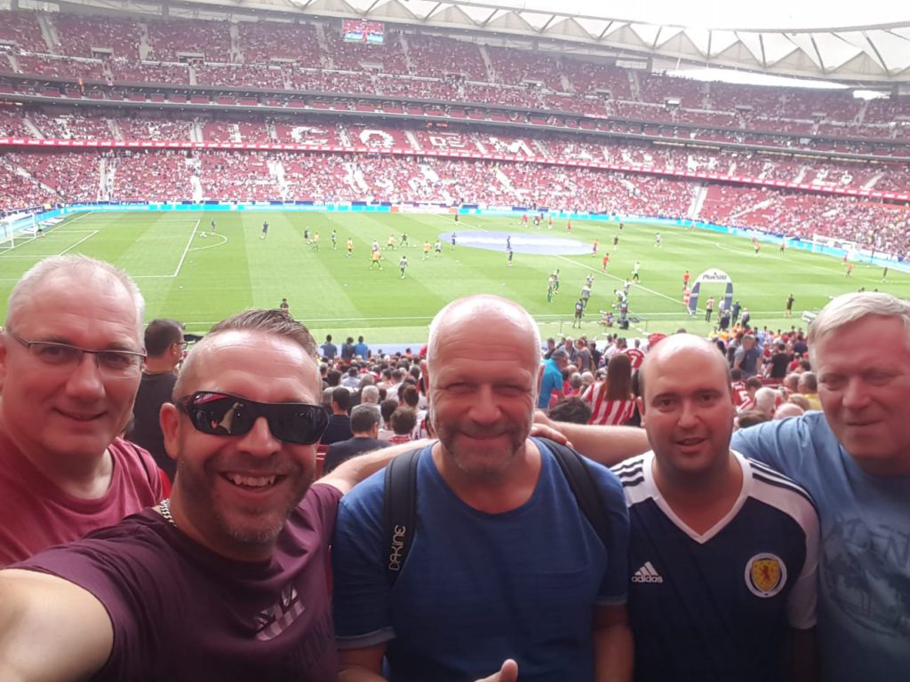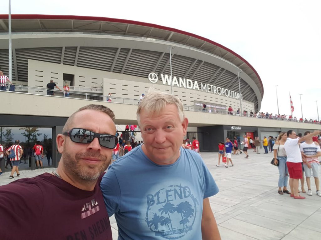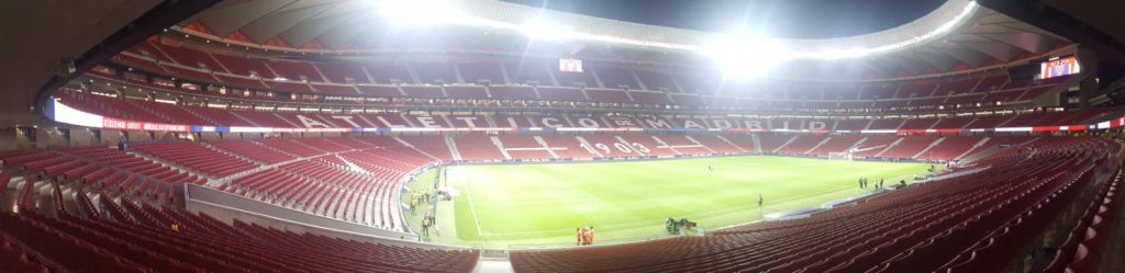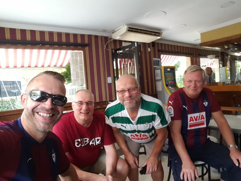 Es wurde mal wieder Zeit ein Spiel von EIBAR in einer repräsentativen NIKSCHUPARMERO-GRUPPE zu schauen. Bekommst Du dann auch noch Herrn NEUMANN, HERRN MAY und Herrn OLBOETER vorgesetzt, kann eigentlich nicht mehr viel schief gehen; gerade auch dann, wenn man zusätzlich noch das ESTADIO WANDA METROPOLITANO auf Tauglichkeit inspizieren darf. Sonntag früh um 4:30 Uhr ging es los. Vielen Dank noch einmal an Fahrer SMAY für den sicheren Transfer zum Flughafen. Guter Flug – Gutes Hotel – Und besonders gute Bodega in Hotelnähe um den zeitlichen Totraum zwischen Hotelankunft und Anpfiff sinnvoll zu nutzen. Vor dem beeindruckenden Stadion trafen wir gleich auf EL PRESIDENTE, der unsere Tickets hatte und von vier verletzten EIBAR-FANS infolge von Randalen sprach. Also ab ging es in die Schüssel, wo 70.000 ATLETICO-FANS warteten, um uns 25 EIBAR-FANS angemessen zu begrüßen.