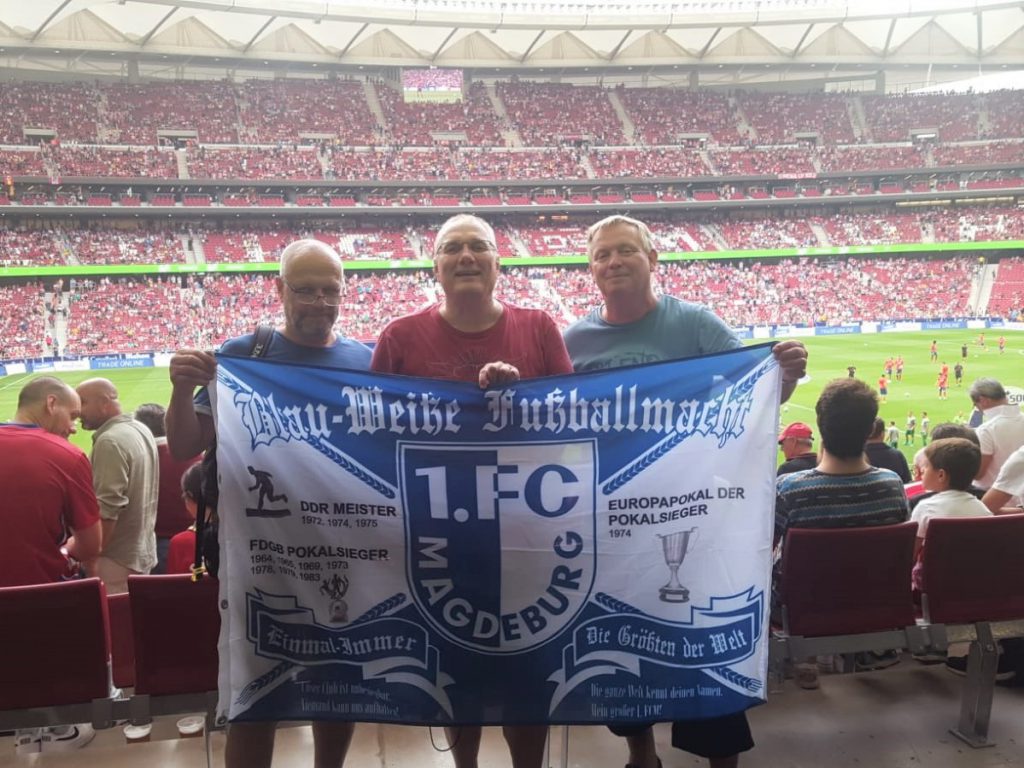 ATLETICO wurde nun immer stärker und VITOLO kickte zum Ausgleich ein (52). Unsere Titanen versuchten nun das Remis überf die Zeit zu retten. Und das gelang auch. Fast! In der 90. Minute stolperte THOMAS den Ball zum wohl verdienten Sieg von ATLETICO in die Maschen. Wir haben ein geiles Match in einem noch geileren Stadion gesehen. Und mal ehrlich, wenn du im nahezu ausverkauften Kessel in der ersten Reihe sitzt und die Medienvertreter sich fast drum prügeln EIBAR-FANS aus MAGDEBURG mit FCM-Fahne abzulichten. Da gerät der Sieg von ATLETICO doch fast in Vergessenheit. MF