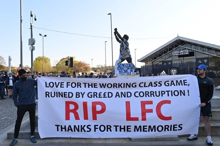 … Die Vereinsführungen knicken nacheinander alle ein. Die SUPERLEAGUE ist gestorben, bevor sie überhaupt geboren war. Hier ein Protest in der Elland Road direkt unter den Augen von BILLY BREMNER (usa todays ftw)