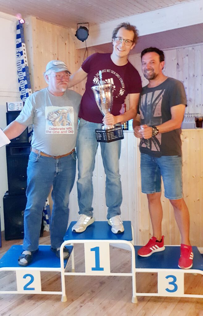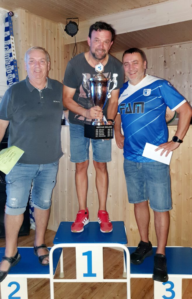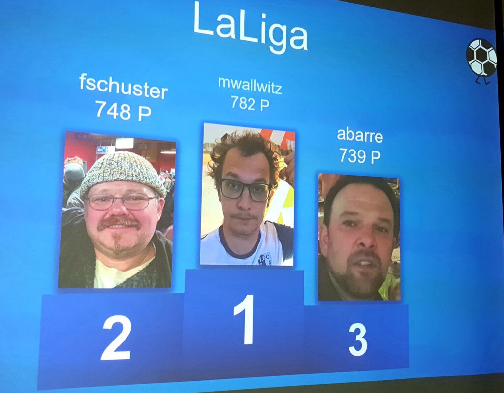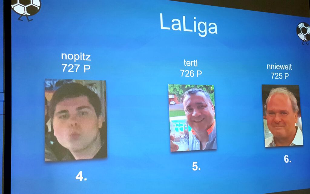 Auch auf die Gefahr hin das es jetzt für den ein, oder anderen langweilig wird, weil er immer wieder die gleichen Namen und Gesichter hört und sieht, es geht weiter mit der SPANISCHEN LIGA. Nein, es ist dieses Mal nicht GGALL der den Pokal in den Händen halten darf, sondern der Sportfreund MWALLWITZ. Mit saustarken 782 Punkten erkämpfte er sich diesen prestigeträchtigen Pokal und kann zu recht stolz auf seine Leistung sein. Dies musste auch neidlos der Geheimfavorit FSCHUSTER anerkennen, der mit seinen 748 Punkten auf den zweiten Platz landete. Und natürlich darf an diesem Abend auch bei dieser Siegerehrung unser ABARRE auf dem Siegerpodest nicht fehlen, der mit 739 Punkten den 3. Platz belegte. Glückwunsch euch Dreien. Die weiteren Plätze 4 – 6 belegten der Newcomer der Saison NOPITZ (727 Punkte), dicht gefolgt vom FC BAYERN unter den NIKSCHUPERN dem Sportfreund TERTL (726 Punkte) und dem absoluten Epikureer NNIEWELT (725 Punkte).