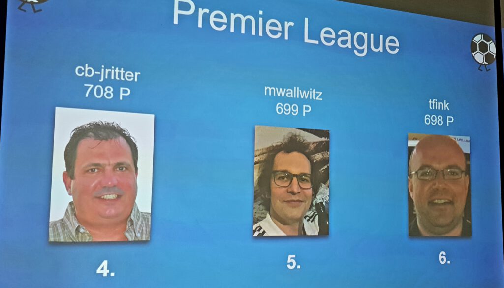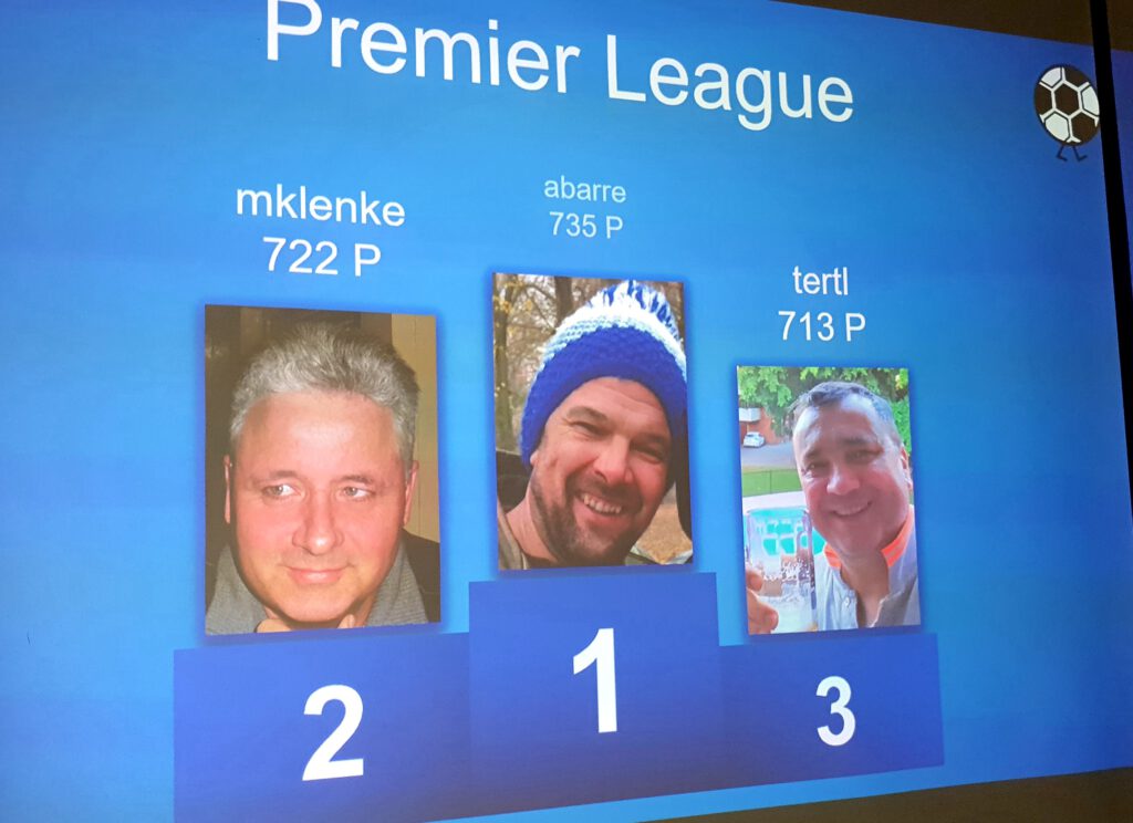 Von SPANIEN ging es dann weiter auf die INSEL, in die PREMIER LEAGUE. Und da ist er dann auch schon wieder, unser ABARRE, zwar ohne Mütze, dafür aber mit Schuhen deren Farbkombination für einen CLUB- Fan so was von gar nicht gehen. Trotzdem muss man seine klasse Leistung von 735 Punkten anerkennen, wodurch er auch völlig zu recht die PREMIER LEAGUE gewinnen konnte. Da hatte leider auch ein MKLENKE (2.Platz) mit seinen 722 Punkten keine wirkliche Chance. Und selbst so ein Tipp- Monster wie unser TERTL (3.Platz) kann da mit seinen guten 713 Punkten nur ehrfurchtvoll gratulieren. Dies wollen wir auch noch mal nachträglich tun und natürlich die Plätzen 4 – 6 nicht unerwähnt lassen. CB-JRITTER belegte mit 708 Punkten den 4. Platz, dicht gefolgt von MWALLWITZ der sich mit 699 Punkten über den 5. Platz freute und TFINK, der es mit 698 Punkten noch auf den 6. Platz schaffte.