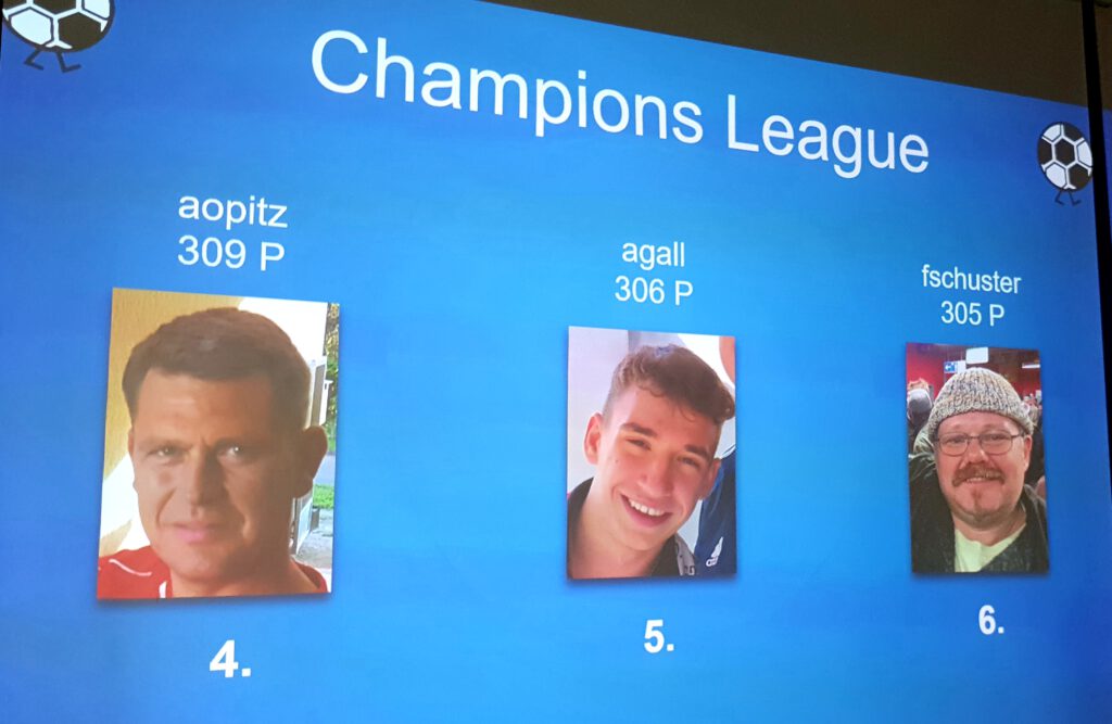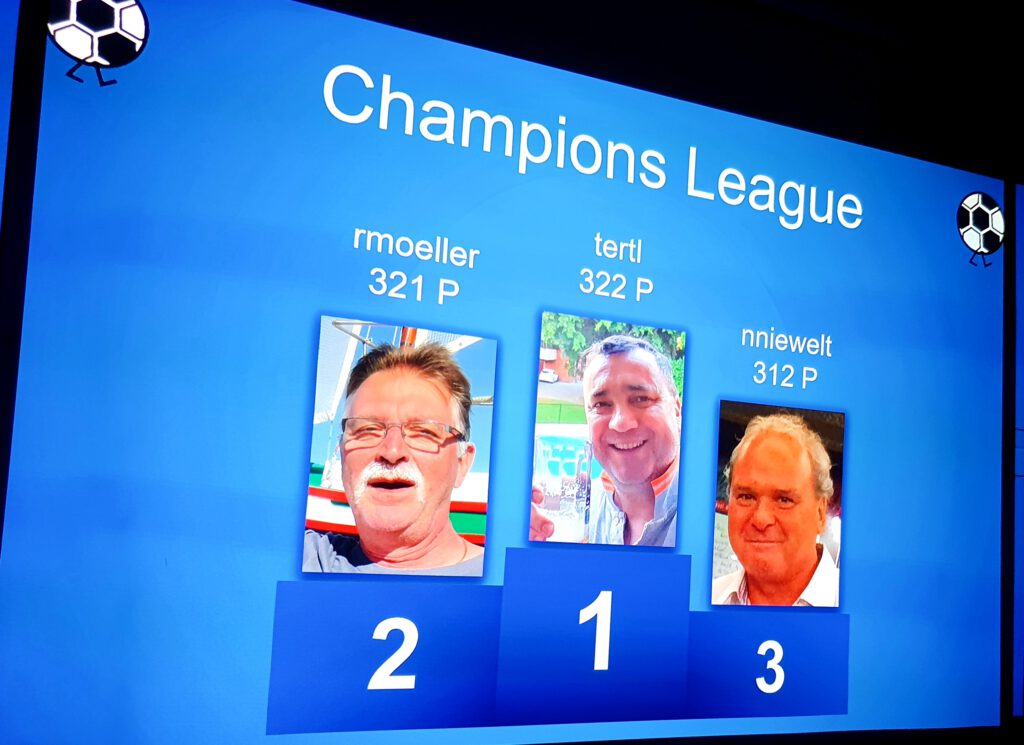Das Beste kommt ja bekanntlich zum Schluss, zumindest was diesen 2. Teil der Siegerehrung anbelangt. Es geht um die Besten der Besten und somit sind wir in der CHAMPIONS LEAGUE angekommen. Wenn man von den Besten spricht, dann ist natürlich ein TERTL nicht weit. Mit königlichen 322 Punkten konnte er sich einen weiteren Pokal für seinen sicherlich sehr opulenten Trophäenschrank ergattern. Ganz knapp dahinter, denn nur ein Pünktchen trennte ihn vom Titel, landete mit sehr opulenten 321 Punkten der Sportfreund RMÖLLER. Lieber RÜDI, ich vermute mal ELLA STUCHNIK ist trotzdem extrem stolz auf dich. Das Siegertrio komplett machte unser Hedonist NNIEWELT mit ebenfalls sehr majestätischen 312 Punkten. Glückwunsch euch Dreien und Gratulation natürlich auch den Plätze 4 – 6. Da hätten wir auf dem 4. Platz mit 309 Punkten AOPITZ, dahinter auf dem 5. Platz AGALL mit 306 Punkten und auf dem 6. PLatz mit 305 Punkten FSCHUSTER.