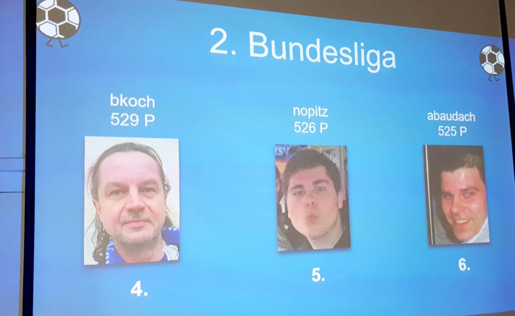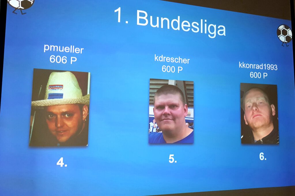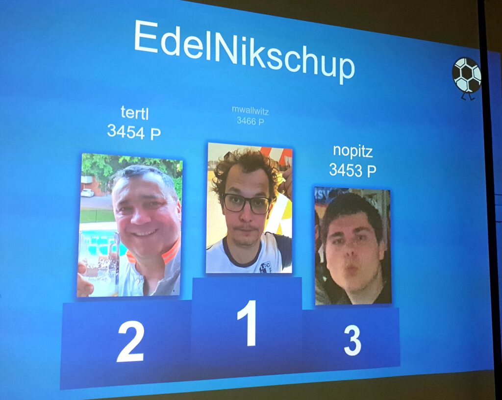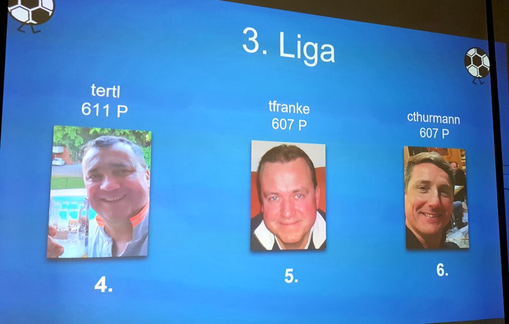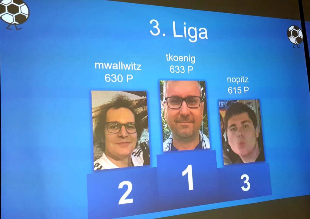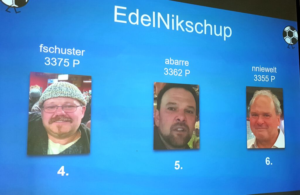 Natürlich darf an solch einem Abend die 3. BUNDESLIGA nicht fehlen, die für viele NIKSCHUPER wohl auch die prestigeträchtigste LIGA sein dürfte, immerhin spielt hier der ruhmreiche 1. FC MAGDEBURG, also die GRÖSSTEN DER WELT. Diesen erstrebenswerten Pokal angelte sich mit 633 Punkten der Sportfreund TKÖNIG. Der Zweitplatzierte MWALLWITZ muss sich aber mit seinen 630 Punkten nicht verstecken und hat ja in dieser Saison die vielleicht vorerst letzte Chance den Pokal mit Beteiligung des großen 1. FC MAGDEBURG zu holen. Mit dem Meistertipp MAGDEBURG wären da ja aktuell schon mal sehr wichtige Bonuspunkte drin. Das Trio perfekt machte der Newcomer AOPITZ, der mit 615 Punkten den 3. Platz erkämpfen konnte. Auch euch Dreien ist unser Glückwunsch gewiss. Dahinter folgen dann auf den Plätzen 4 – 6 so tippstarke NIKSCHUP- GRÖSSEN wie unser Titelraffke TERTL (611P = Platz 4) , der Fast-Alles-Fahrer TFRANKE (607 P = Platz 5) und der Selfie-Man CTHRUMANN (607 P = Platz 6).