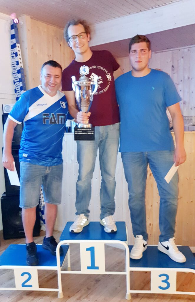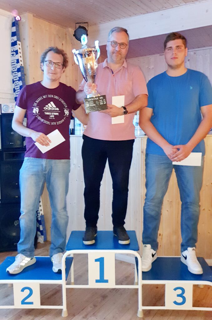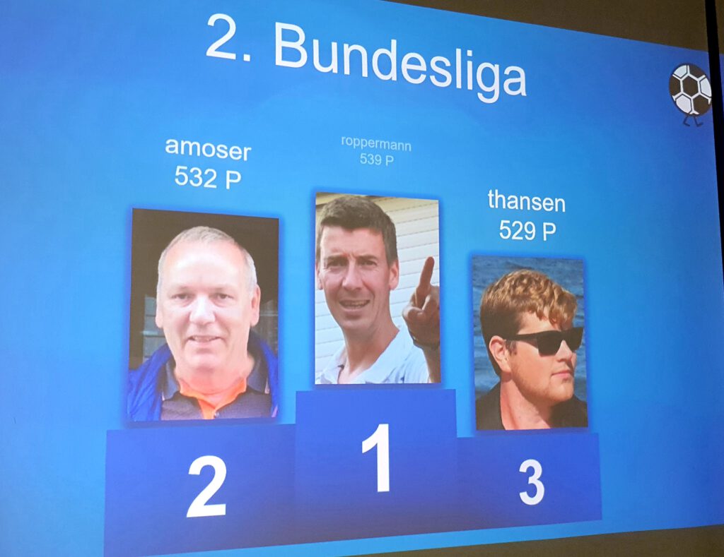 Eine Stufe niedriger, aber deshalb nicht weniger spannend, verlief aber auch der Kampf in der 2. BUNDESLIGA. Hier konnte sich am Ende der Sportfreund ROPPERMANN mit beachtlichen 539 Punkten durchsetzen. Da hatte der Moderator des Abends AMOSER mit 532 Punkten ganz knapp das Nachsehen, gratulierte aber sportsmännisch und strahlte auf dem Podest fast mehr als der Sieger. Leider nicht anwesend aber trotzdem mit einer tollen Leistung schaffte es THANSEN mit 529 Punkten ebenfalls aufs Podest. Auch euch Dreien auf diesem Wege noch mal die herzlichsten Glückwünsche. Auf den Plätzen 4 – 6 folgten dann mit 529 Punkten der trinkfreudige BKOCH (Platz 4), mit 526 Punkten der Newcomer NOPITZ (Platz 5) und mit 525 Punkten der unverwüstliche ABAUDACH (Platz 6).