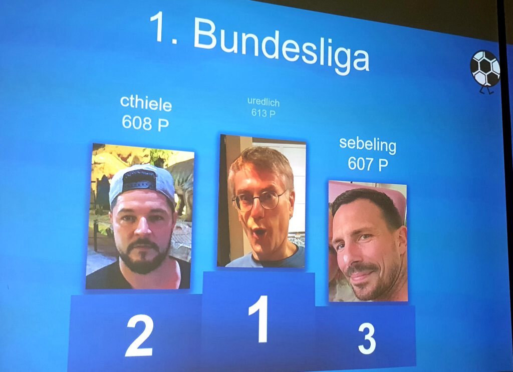 Im nunmehr dritten Teil unserer Siegerehrung kommen wir jetzt zum absoluten Flaggschiff unserer NIKSCHUP-Tippligen, denn wer in der 1. NIKSCHUP-BUNDESLIGA gewinnt, kann sich wahrlich als ein Meister des Tippens bezeichnen. Dieses Jahr ging der meistbegehrte Pokal an den Sportfreund UREDLICH, der mit seinen herausragenden 613 Punkten diesen für sich erringen konnte. CTHIELE hatte da mit seinen 608 Punkten keine Chance und musste sich mit dem 2. Platz zufrieden geben. Komplettiert wurde das Siegertreppchen durch SEBELING der mit 607 Punkten den 3. Platz eroberte. Glückwunsch euch Dreien. Den Podest nur knapp verfehlten in dieser Spielzeit PMUELLER (606P) auf Platz 4, KDRESCHER (600P) auf Platz 5 und KKONRAD1993 (600P) auf Platz 6, aber der Anspruch ist bei den Jungs sicher groß, in dieser Saison den bekannten nächsten Schritt zu machen.
