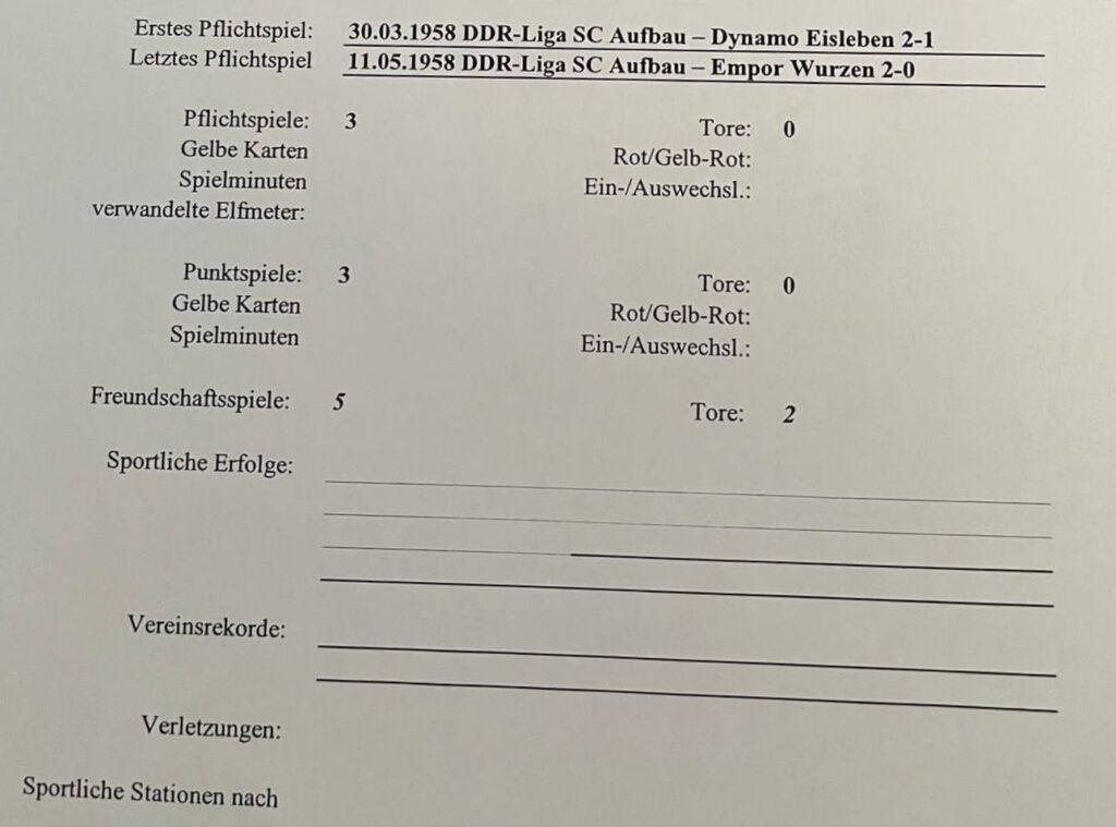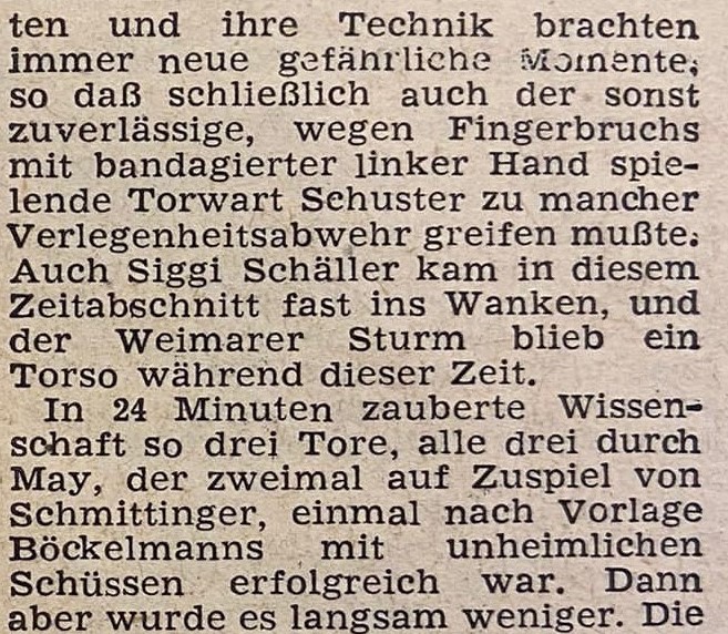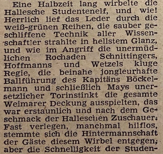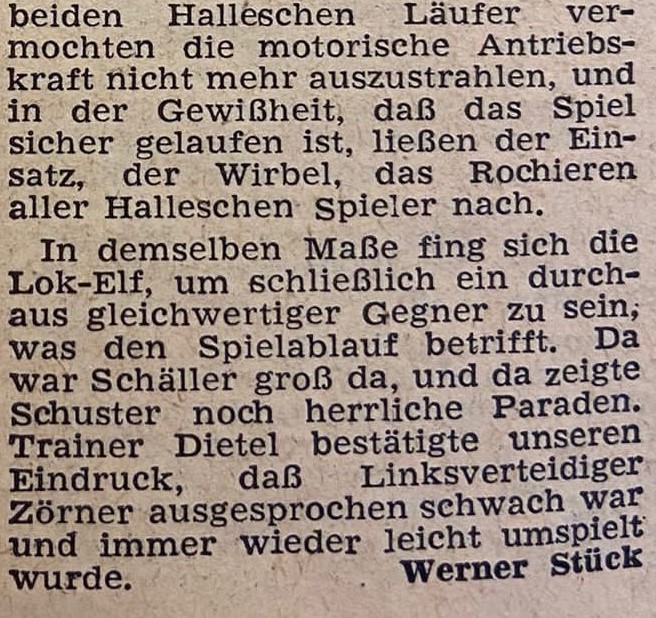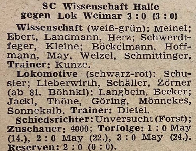Der älteste NIKSCHUP, der jemals in den NIKSCHUP-LIGEN unterwegs war, ist von uns gegangen. Bereits am 14. Januar diesen Jahres verstarb NORBERT MAY im Alter von 89 Jahren. Ein echtes Urgestein mit absoluten Fußball-Sachverstand können wir NORBERT MAY nennen, der auch erfolgreich selbst die Töppen schnürte. In den 50-iger Jahren war er als Stürmer für Wissenschaft Halle in der DDR-Liga schwer gefürchtet. Unter Trainer-Legende ALFRED KUNZE, der 1966 aus dem „REST VON LEIPZIG“ mit CHEMIE LEIPZIG den ersten und einzigen DDR-Meistertitel feierte, wuchs NORBERT MAY zu einem gefürchteten Stürmer heran, der für WISSENSCHAFT HALLE in den Fünfziger Jahren viele Tore erzielte. Gerade seine ausgesprochene Schusskraft führte zu vielen Toren aus der zweiten Reihe und ließ die Keeper der DDR-Liga gleich reihenweise erstarren. Es folgt ein Ausschnitt aus der fuwo aus März 1957. WISSENSCHSFT HALLE gewinnt gegen MOTOR WEIMAR 3:0 und NORBERT MAY glänzt mit einem lupenreinen Hattrick innerhalb von 10 Minuten. Ich würde mal sagen Weltklasse. Aber lest selbst.