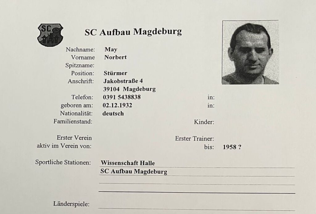 Das Archivblatt des 1. FC MAGDEBURG über seinen ehemaligen Spieler NORBERT MAY.