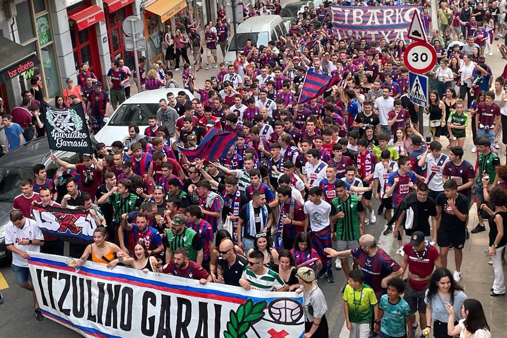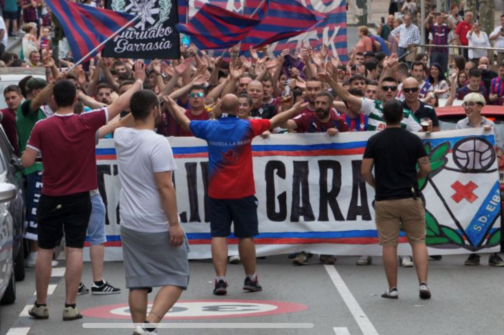Dann um 22:00 Uhr! Der Anpfiff! Und beide Teams legten los, als gäbe es kein Morgen mehr. TENERIFFA anfangs auch mit intensiven Forechecking und ein zwei Halbchancen. Aber je länger das Match lief, zeigten unsere Jungs, wohin diese drei Punkte gehören und nach und nach sprang der Funke von der Osttribüne auch auf die langen Geraden über. Man peitschte sich gegenseitig hoch. Und als Dank für diesen Support legte STOICHKOV, wie einst sein berühmter Namensvetter ein Dribbling durch die verdutzte Inselabwehr hin und schob, als wäre es das Selbstverständlichste der Welt unter tosenden Geschrei von 8.000 EIBAR-KEHLEN souverän zum 1:0 ein (19.). Klare Ansage, wer hier zu Hause ist. Von TENERIFFA (bereits für die Relegation qualifiziert) kam nicht mehr viel. Halbzeit! Und im Durchgang 2 legten unsere Stars noch mal los, als wolle man zweistellig gewinnen. Vier bis fünf Riesenchancen auf unser Tot vor der Osttribüne zeugen von einer nun selten dagewesenen Überlegenheit unserer GALAKTISCHEN. Und dann Herr GARITANO, wenn man sich nämlich traut in den gegnerischen Strafraum zu spielen und den Gegner permanent unter Druck setzt, entstehen auch Chancen. Und wer Chancen hat, macht dann zwangsläufig auch irgendwann sein Tor. So geschehen in der 84. Minute, als mal wieder nach einer Flanke von links gleich drei ARMEROS hätten einschieben können und CHEMA dann diese Riesenchance zwingend über die Linie drückt. 2:0! Ein Spiel der Superlative, möglicherweise das Beste Spiel der Saison vor einem Support, in dem in der zweiten Halbzeit alle Fans die von ESKOZIA LA BRAVA vorgegebenen Songs gemeinsam durch die Arena brüllten. Der wohl beste Fansupport in IPURUA, den es jemals gegeben hatte, so war man sich hinterher in den Fachgesprächen im ERROMES absolut einig. AMY bekam dann noch vom sich im Siegesdelirium befindlichen FERNANDO das ARMERO-TRIKOT geschenkt, welches in beiden Fanshops in ihrer Größe vor dem Spiel nicht mehr zu bekommen war. Ein EIBAR-TAG, den alle und insbesondere wir nicht so schnell vergessen werden; auch wenn wir noch nicht endgültig aufgestiegen sind. Aber das sollte ja beim Tabellenletzten ALCORCON in einer Woche nun überhaupt kein Problem mehr sein, den Aufstiegssack dort endgültig zuzumachen. Denn ganz klar konnten wir ja davon ausgehen, dass unser Trainer mit dieser selben Offensivtaktik mit knallharten Forechecking ALCORCON solange bearbeiten wird, bis unsere notwendigen Tore dort zum Sieg und somit zum Direktaufstieg fallen werden.