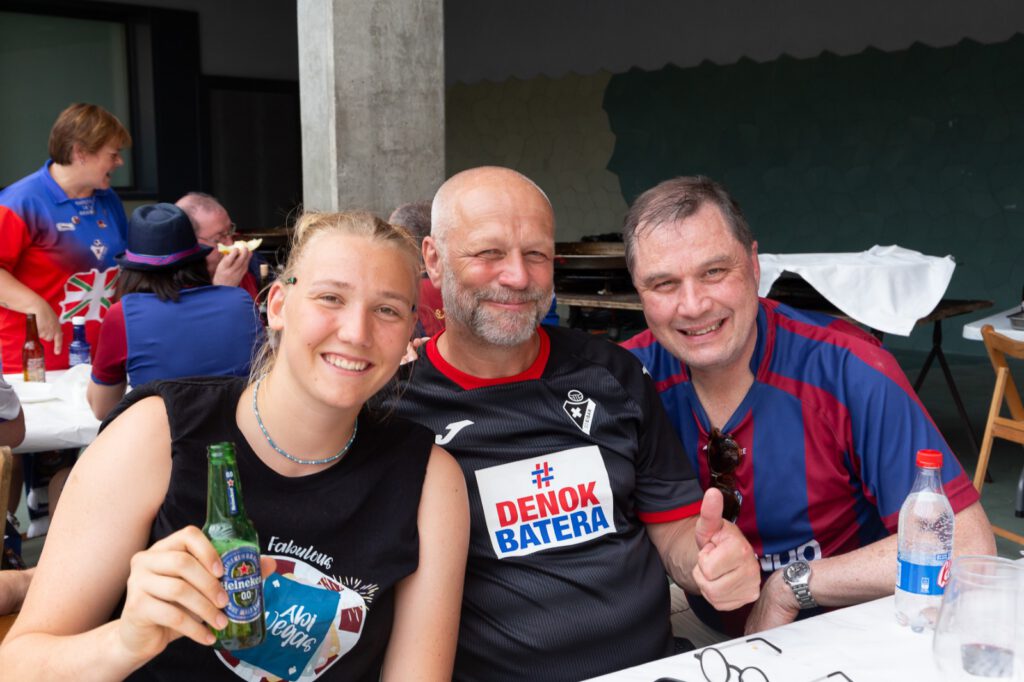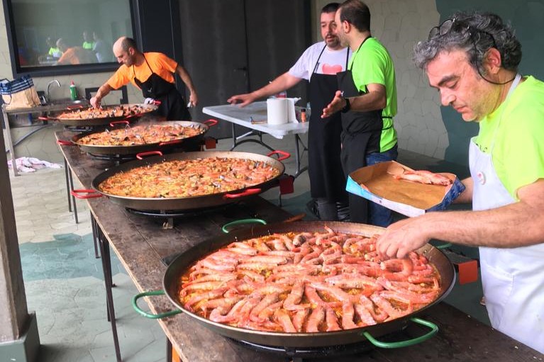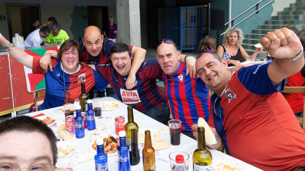 Dann ging es ab in die Markthalle, wo vier Riesenpaella-Pfannen auf ca. 85 ARMEROS warteten, um bei Wein und Bier genossen zu werden. AMY, meine NICHTE gewann eine der begehrten Preise bei der Lotterie und beim Tänzchen waren die ARMEROS pfeilschnell hinter AMY. Danach ging es auf den Straßen munter weiter. Die Stimmung peitschte sich in Form immer wieder auftretender ARMERO-CHÖRE hoch und gipfelte in einem Fanmarsch, der mich an die aus DDR-Zeiten bekannten Mai-Demonstrationen erinnerte. Kurzer Talk mit JESUS noch und dann ab in den Kessel von IPURUA, wo sich die Jungs von ESKOZIA LA BRAVA für einen 90 Minuten dauernden Gesang gerade noch einmal die Stimmbänder zurecht zupften.