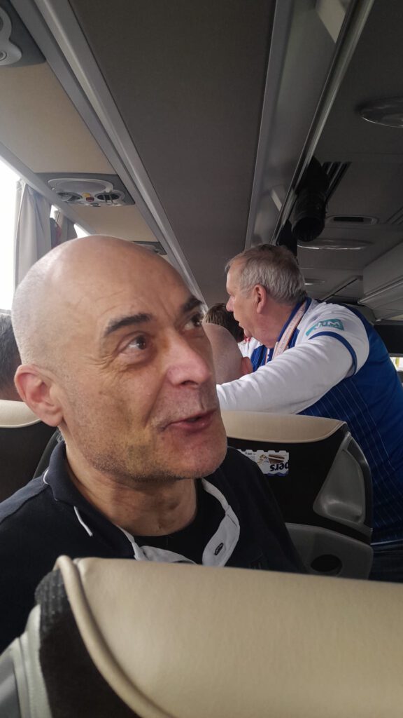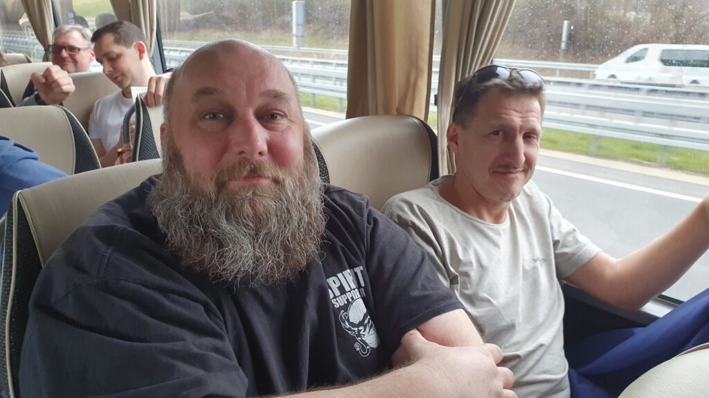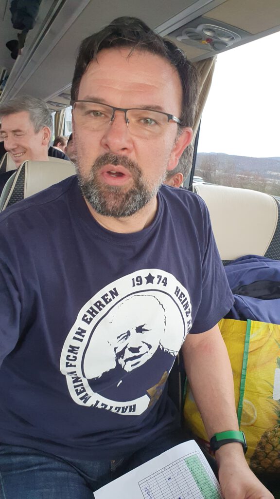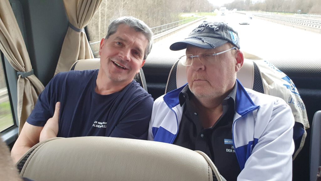 Auch für diese NIKSCHUP- Reise hatte sich das ORGA-TEAM wieder etwas einfallen lassen und so wurden alsbald recht großzügig ausfallende blaue Hoodies im Bus verteilt. Der ein oder andere NIKSCHUPER, der zuvor noch Bedenken hatte, sich bei seiner vorab übermittelten Größenangabe vielleicht doch verschätzt zu haben, atmete sogleich hörbar auf, nicht wahr KARL- HEINZ. Die Vorfreude auf BELGIEN stieg mit jedem Kilometer und die Stimmung im Bus war super. Natürlich wurde dabei auch wieder angeregt diskutiert und gefachsimpelt. Da auch bei dieser Reise das ein oder andere neue Gesicht auftauchte und man ja nicht unbedingt jeden NIKSCHUPER beim Namen kennt, ist es vielleicht ganz praktisch hier mal bildlich ein wenig Nachhilfe zu geben.