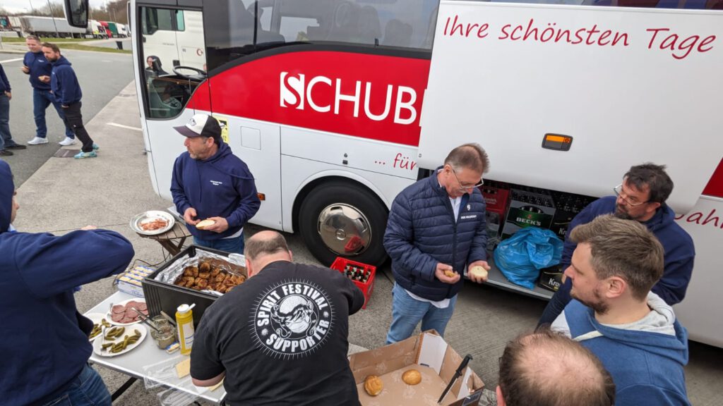 Irgendwann hielt der Reisebus dann auch an und es wurde zum Festschmaus gebeten. Hierfür zuständig war dieses Mal das legendäre CUBA-Libre-Quartett angeführt vom Hedonisten FSCHUSTER, besser bekannt als BABSI, dem Womanizer RMOELLER, hört aber auch auf den Namen RÜDI, der neuen Fußball- Koryphäe RHOSANG, oder für seine Freunde auch RAINI und der unaussprechliche JCIECHORADSKI, odereinfach nur kurz JENS, die mit ganz viel Liebe und wenig Alkohol gefühlt 300 Bulletten für uns gebraten haben. Einfach nur lecker Jungs und vielen Dank noch einmal. Auch wenn der Sportfreund MFLACH bei dieser kulinarischen Pause die Kochmütze auf hat, bestand sein aktiver Beitrag dieses Mal nur im Koordinieren der Aufgabe, aber auch das muss man erst einmal können.
