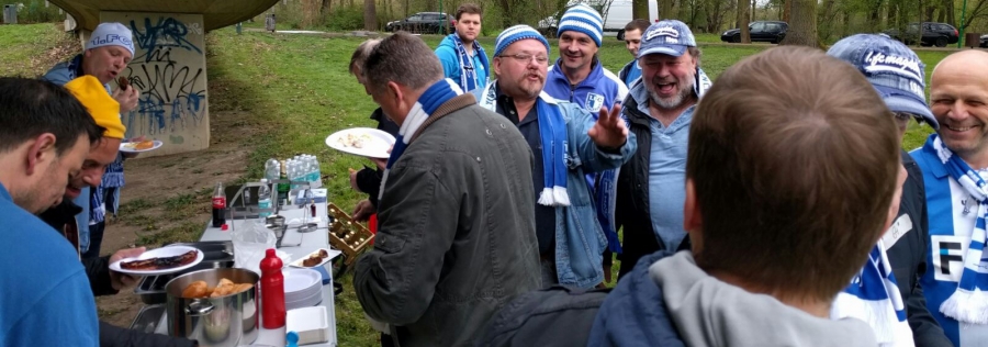 Auch am zweiten Tag machten die Profis von NIKSCHUP natürlich keine leichte Beute. 10:00 Uhr morgens: Kümmerling. Zum Glück nicht auf leeren Magen, denn vorher gab es schon ein Pils! Mein Körper rebellierte nicht mehr, sondern gab sich seinem Schicksal hin. Was sollte er auch machen. Aus den Fängen von NIKSCHUP kann und will man sich nicht befreien. Wo bekommt man morgens um 10 in Magdeburg ein Pils und ein Kümmerling? An einem perfekt organisierten Grillstand im wunderschönen Stadtpark. Ihr seid richtige Profis. Jeder Handgriff sitzt. Jeder kennt seine Aufgabe. Jeder hilft mit. Und 10 Minuten später stehen 50 Nikschuper vor einem Riesentransparent und genießen die Zeit vor dem Derby mit der besten Bratwurst und der besten Frikadelle, die ich je gesessen habe. Danke STEFAN.