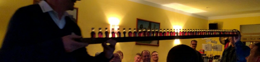 Die Lücke, die die Nervosität hinterlassen hatte, wurde zuverlässig von der Wirtin STEFFI(?) mit Bier gefüllt. Der Alkoholpegel war bereits bedenklich. Und dann kam der Aufguss: Eine 3 Meter lange Latte mit Kümmerling betrat den Raum. Mir war klar, dass das nicht gut enden würde. Kurzer Schwächeanfall, dann gings weiter.