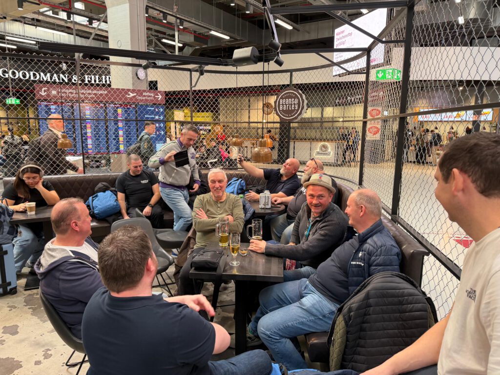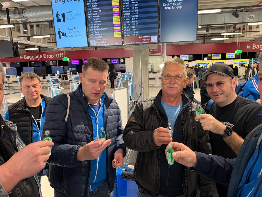 Am Freitag den 13. (das fällt mir echt jetzt erst auf) ging es für unsere NIKSCHUP- Reisegruppe los nach BUDAPEST. Ein Teil der Gruppe traf sich gegen 06:30 Uhr schon mal zum gepflegten Vorglühen im GNEISENAURING, einer sehr berüchtigten Party-Lokation, um sich dort vom NIKSCHUP- Präsi noch schnell die letzte Ölung und ein wenig Reiseproviant abzuholen. Der zweite Teil trudelte in kleinen, zu meist selbst organisierten Mitfahrgelegenheiten so nach und nach in der Hauptstadt der DDR ein. Auf dem uns bestens bekannten Flughafen Berlin-Schönefeld (SXF), von wo früher mal die staatliche Fluggesellschaft INTERFLUG über 50 Ziele auf der ganzen Welt anflog, kam es dann zu liebevollen Begrüßungsszenarien unter uns NIKSCHUPERN.